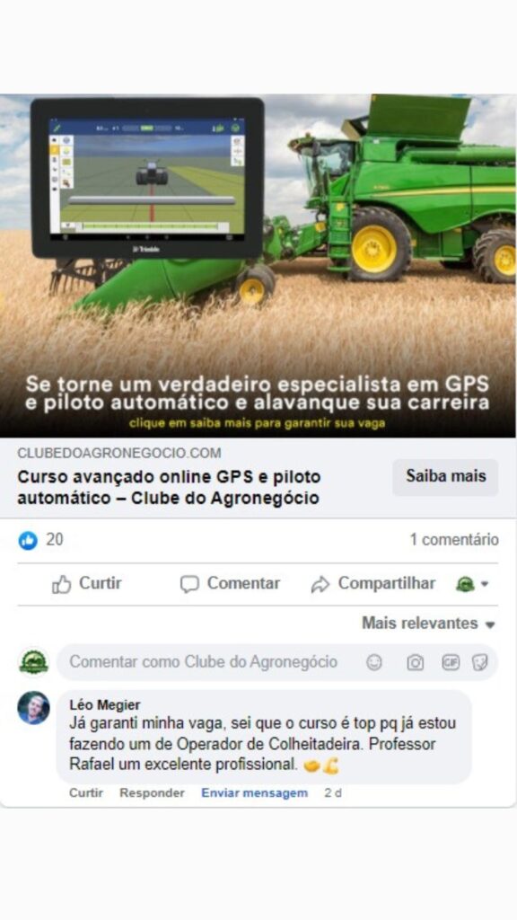 Se você é um profissional em busca de aprimoramento contínuo e deseja dominar as fronteiras da mecanização agrícola, este curso é para você. Adquirindo conhecimento em GPS e Piloto Automático, você não só aumenta sua eficiência operacional, mas também amplia sua relevância e passa a ser o profissional mais requisitado no campo.